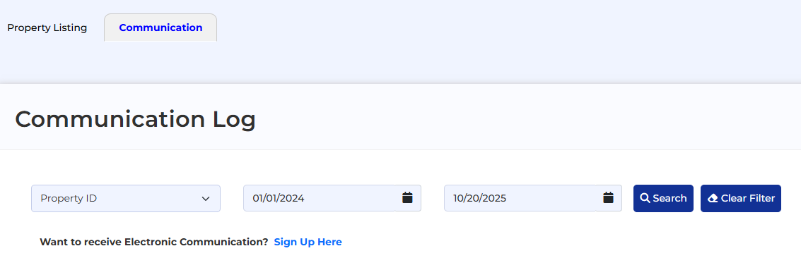 To sign up for electronic communication online, please send an email to tax@wilsoncountytx.gov requesting your Property ID number and required PIN. We will respond back with your information. Then go to https://portal.tax.wilsoncountytx.gov/, register using your PID and PIN then log in, click the Communication tab. Look for the Want to Receive Electronic Communication? Click on Sign Up Here